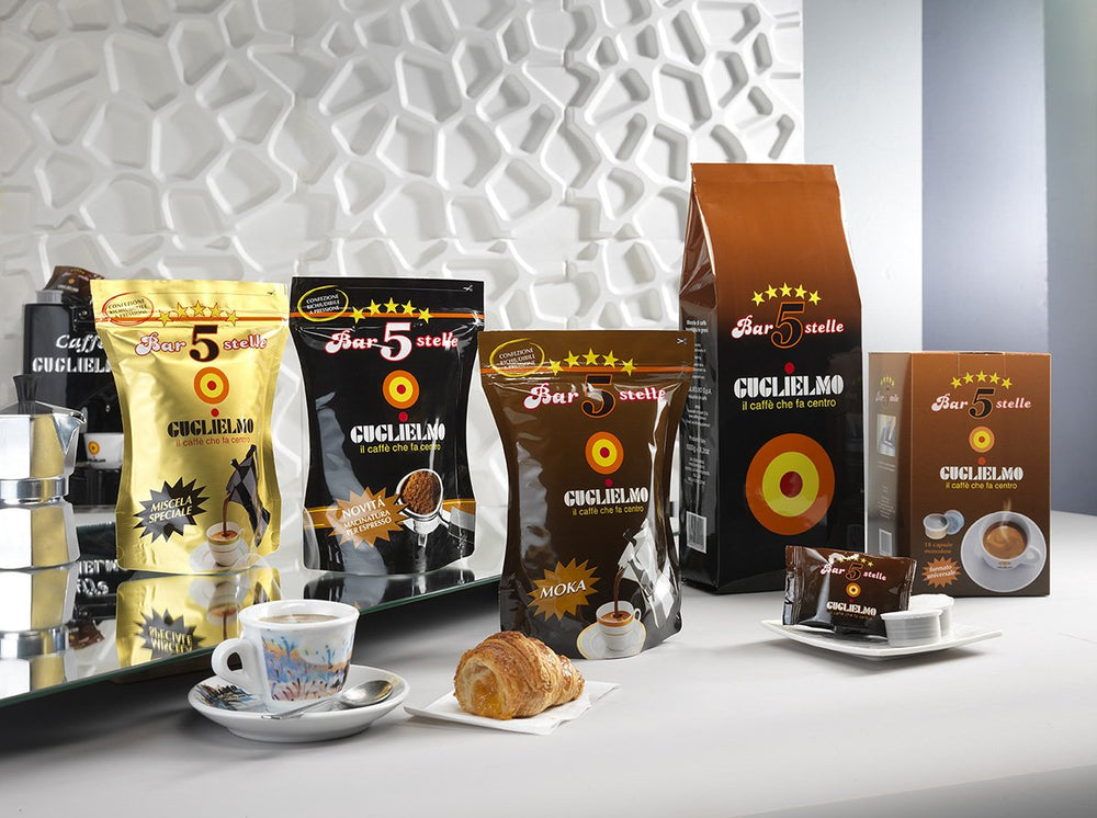 Caffé Gugliemo Bar 5 Stelle Moka 250 g ist die perfekte Verbindung zwischen einer speziellen Mischung aus geröstetem und gemahlenem Kaffee und einer revolutionären Verpackung mit Ventil in einer Schutzatmosphäre, die den Schutz des Duftes und des Aromas eines hochwertigen Kaffees über die Zeit garantiert . Qualität. Diese absolut innovative Verpackung ermöglicht es uns, den Kaffee unmittelbar nach dem Rösten und Mahlen zu verpacken und garantiert eine optimale Produktkonservierung über die Zeit. Für diejenigen, die einen Kaffee mit einem vollen und runden Geschmack lieben.