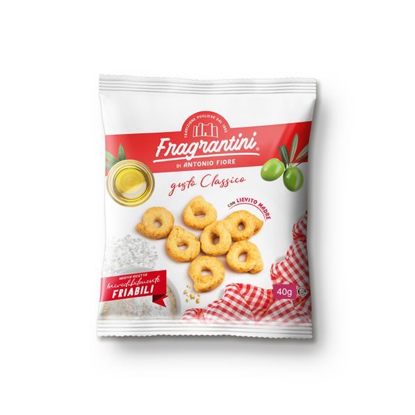 BESCHREIBUNG Unsere unkonventionelle Variante des Tarallo-Konzepts. Mit rauer Oberfläche, knuspriger und leichter als ein einfacher apulischer Tarallino. Der ursprüngliche und vielfach nachgeahmte Premium Fragrantini Traditional-Geschmack, erhältlich im 40-g-Format.
