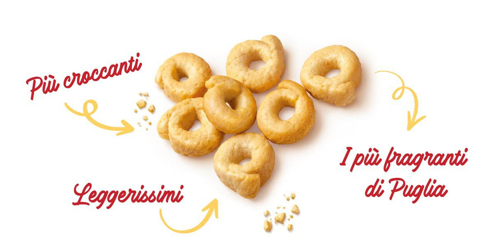 Die traditionellen Taralli sind das Ergebnis einer Tradition, die von Generation zu Generation weitergegeben wird. Ein Rezept, das den ganzen Geschmack der handwerklichen Verarbeitung bewahrt.